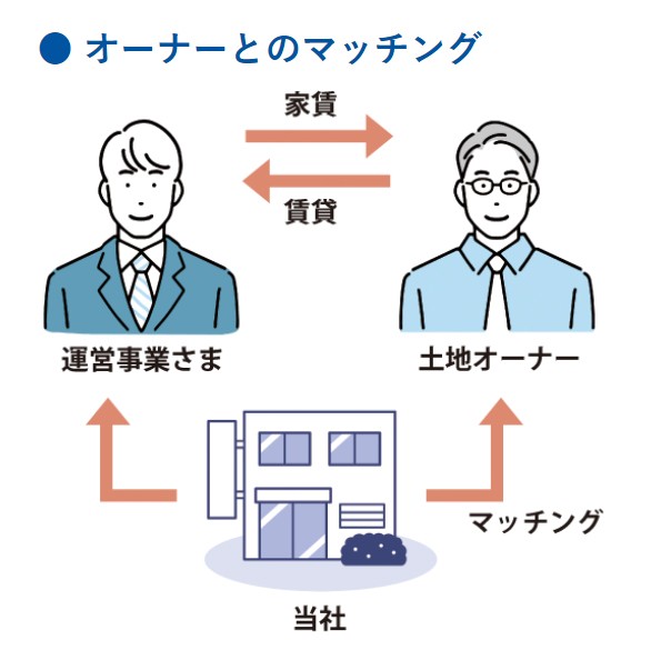 土地の仕入れや地元の地主様とのパイプを持つ経験豊富なスタッフが、その土地の利を生かしてサポートさせていただいております。福祉施設の建て貸しにご興味をお持ちのオーナー様を多数抱えております。介護・障がい事業者さまからご希望があれば、ご紹介を致します。